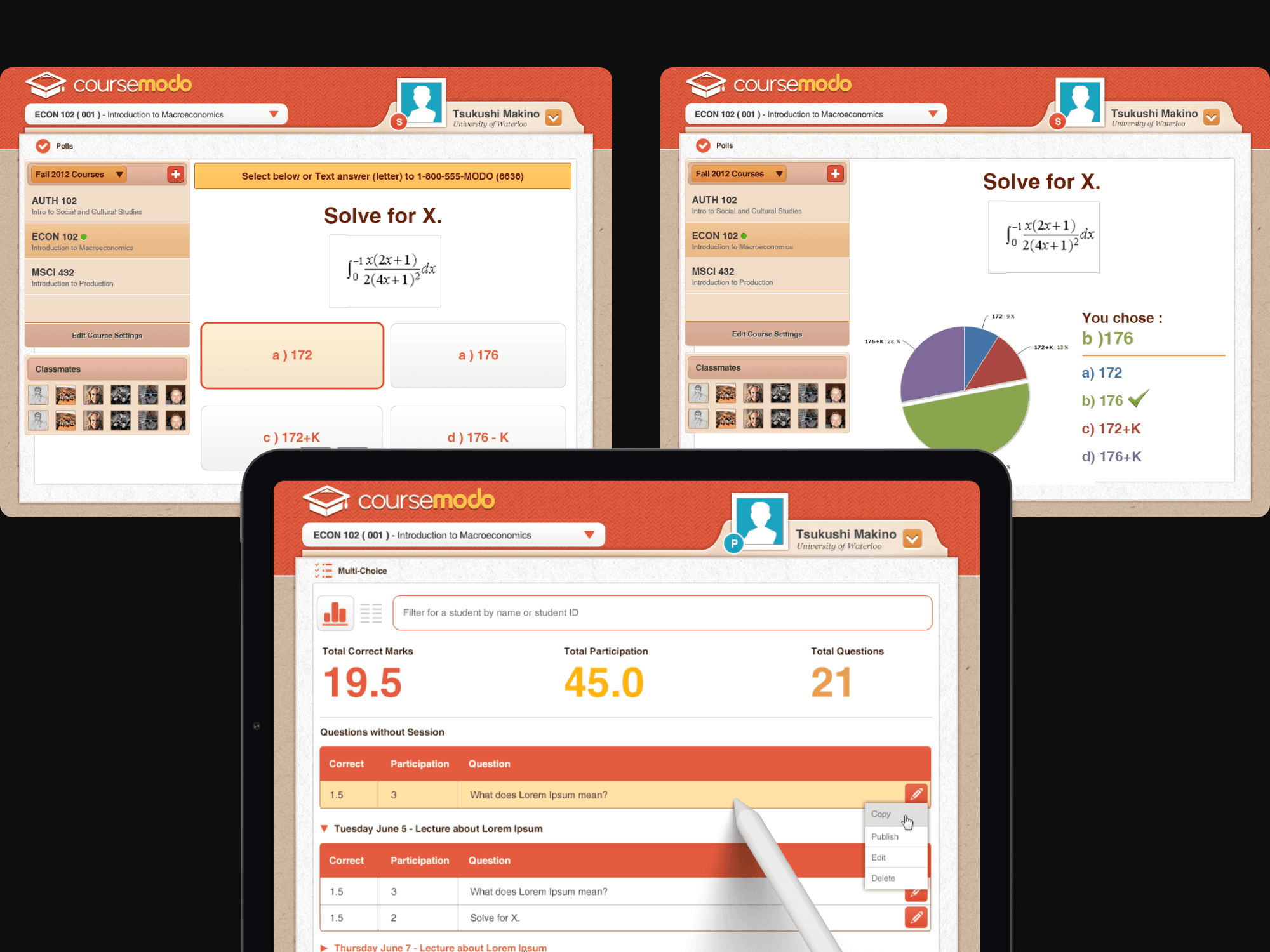 Coursemodo was designed to help educators actively engage all of their students through polling, quizzing, announcements and also allow students to ask questions through a live question stream. Many pilot schools provided tablets for students but the apps also supported SMS text and smartphone web clients.