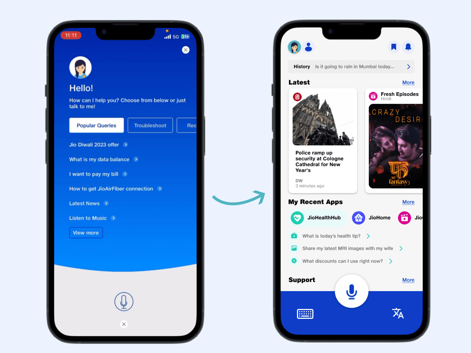 As a consultant, I collaborated with the larger, dedicated HelloJio team over several months. I’m proud to have contributed to shifting the project’s direction from a technology-driven strategy to a user-centric one. While elements of the prototypes we developed are present in the final product, the true success lies in the adoption of an overhauled, user-focused design methodology that defined the HelloJio redesign and serves Jio users better.