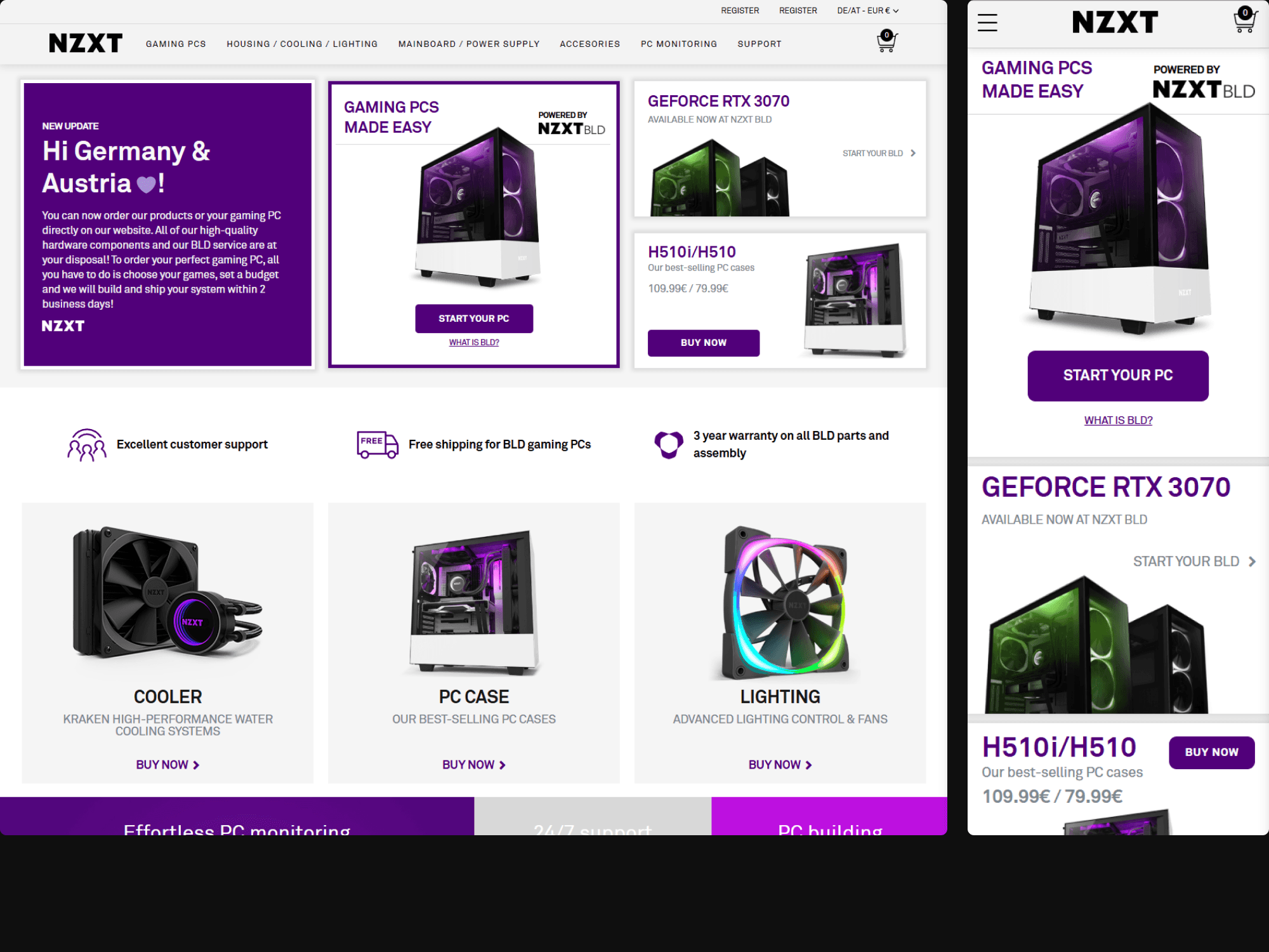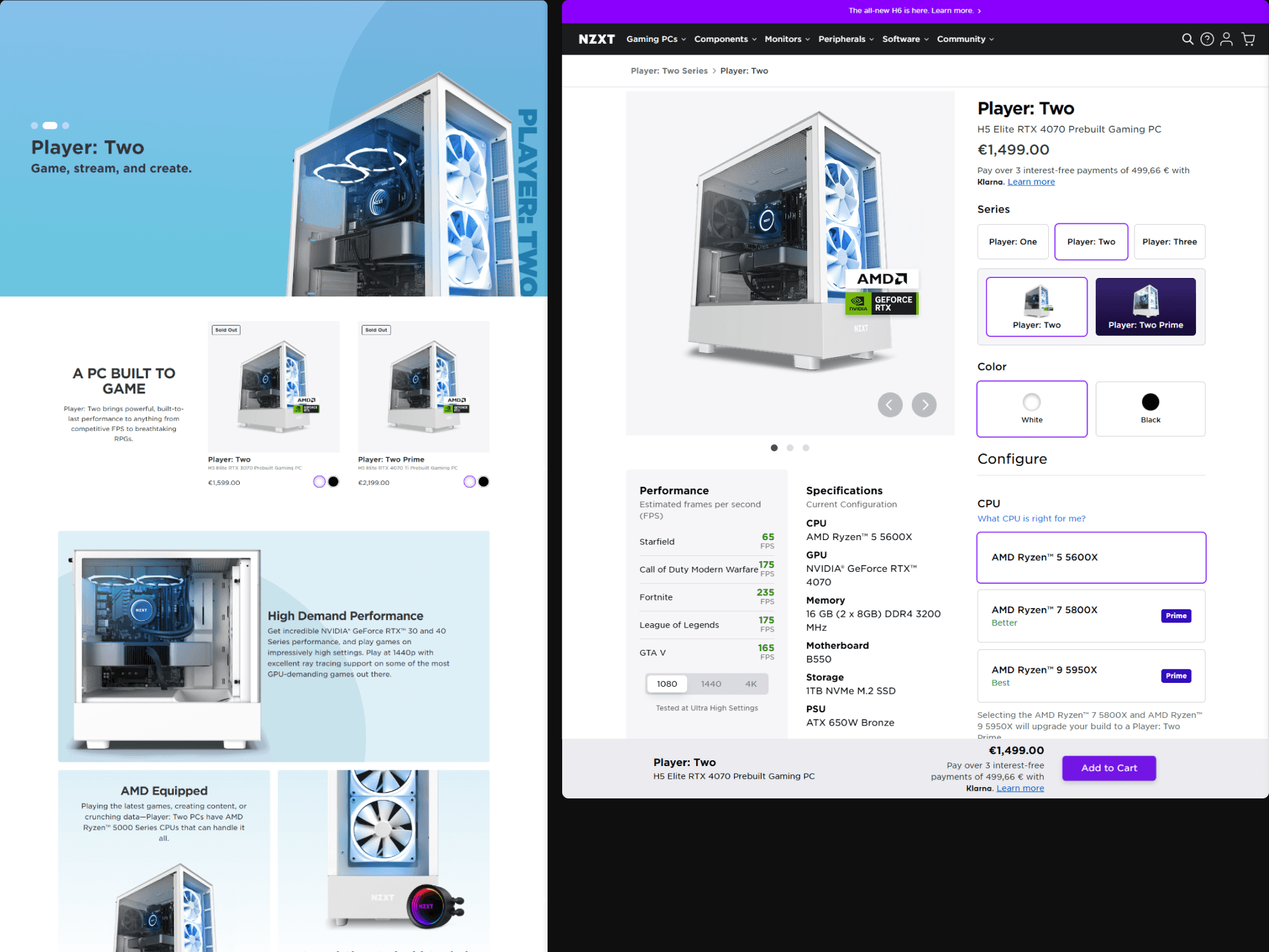 If you look at these two websites, they don't look related. Further, these approaches also had little resemblance to the iconic, minimal (and clean white) design that NZXT is known for which is characterized by whitespace and "hits of purple". Everything is NZXT and for it be a DTC store and destination for all NZXT products - it needed a new design and new architecture.