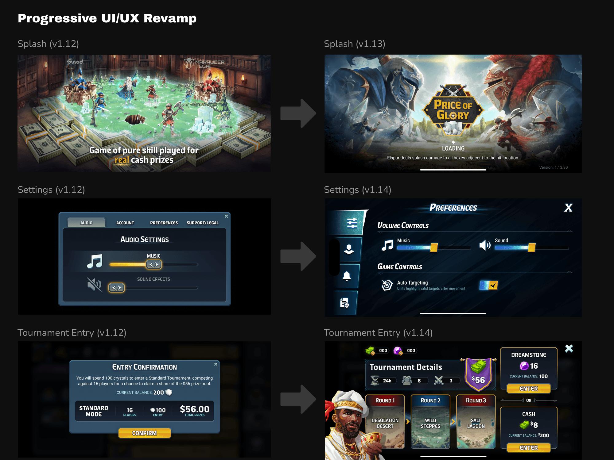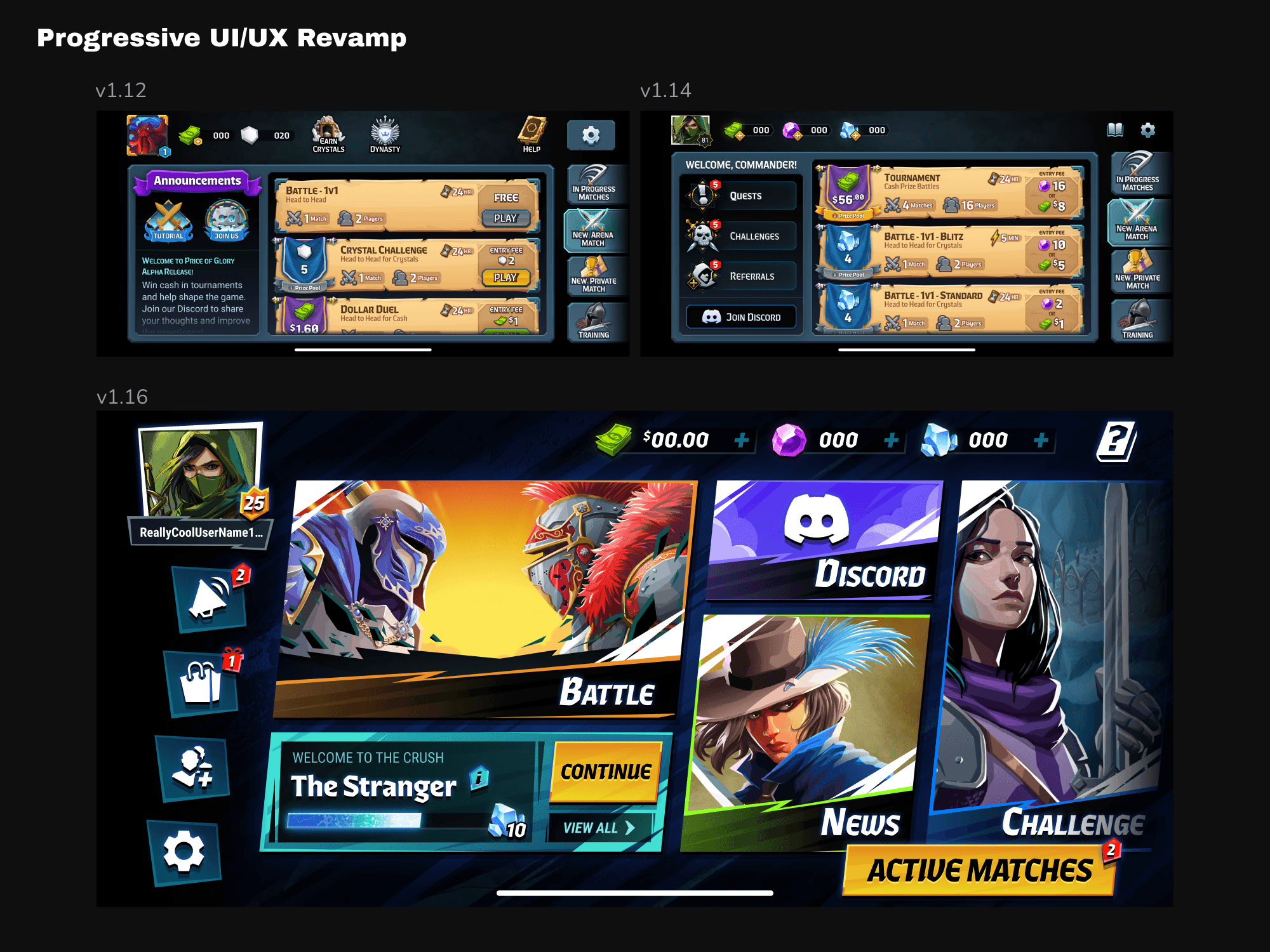 Previously the game focused heavily on competition and skill-based cash aspects. With a relatively small player-base and a number of core systems in need of more cohesion: I updated the product approach to progressively refocus the game on building more overall matches, implementing early onboarding while imbuing narrative consistency and building scalable UI/UX and content pipelines.