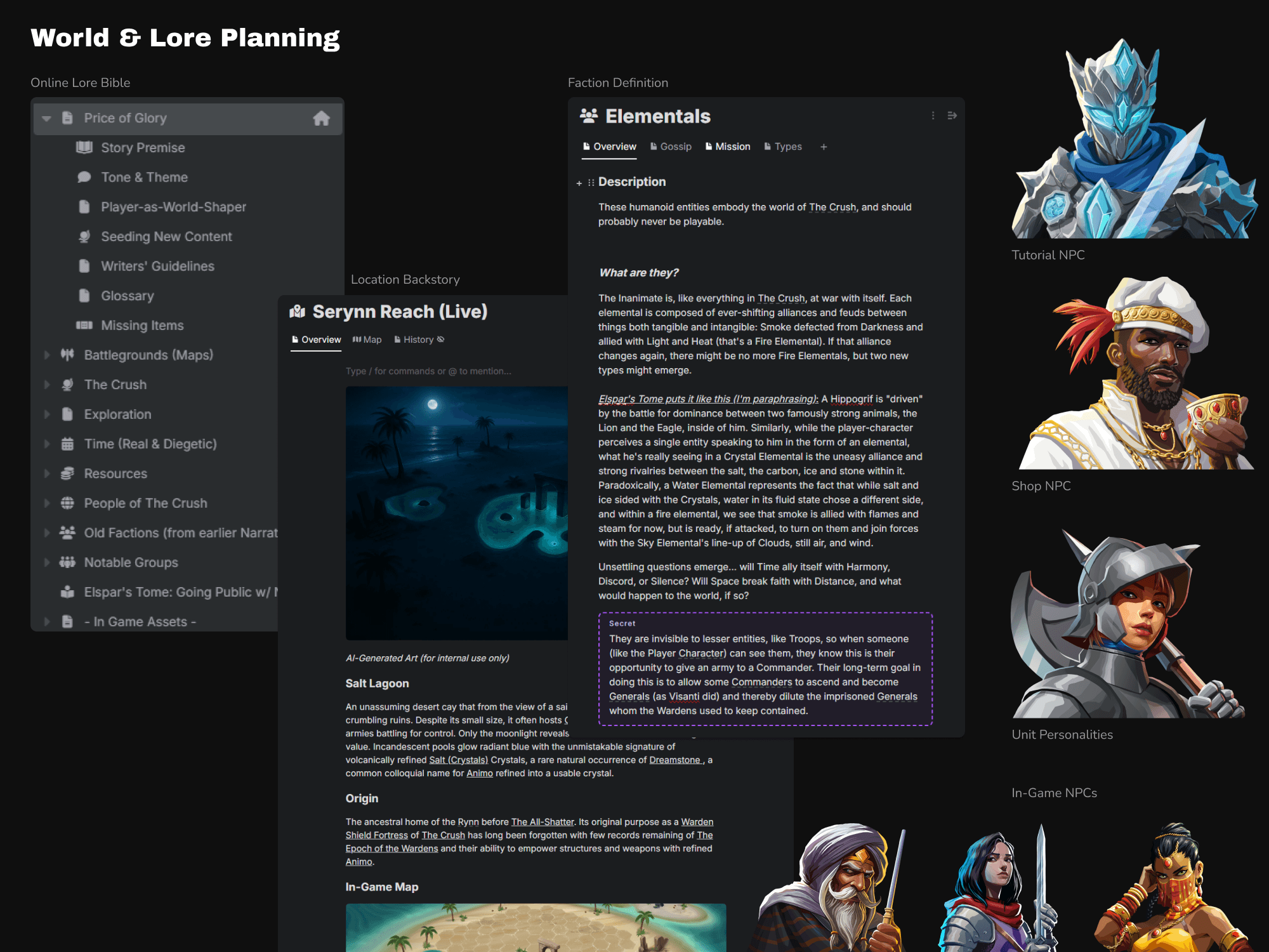 Early-on, I identified a gap between the strength of the game’s systems and the clarity of its world. To address this, I led efforts to establish greater lore consistency, introduce new characters, and expand tutorial and single-player-focused content. These additions provided narrative context for gameplay mechanics, helping players understand not just how to play, but why the world exists and why they are fighting.