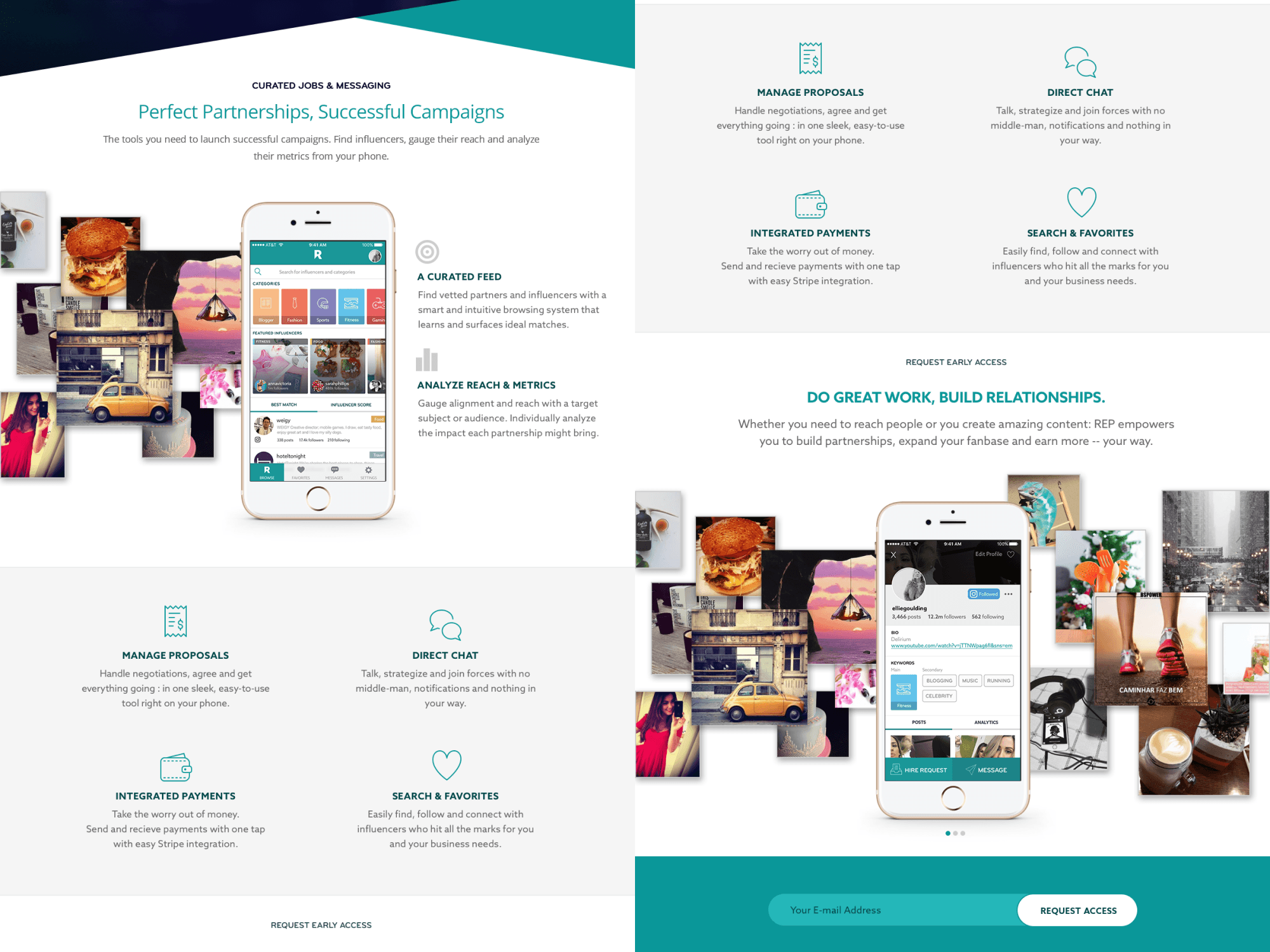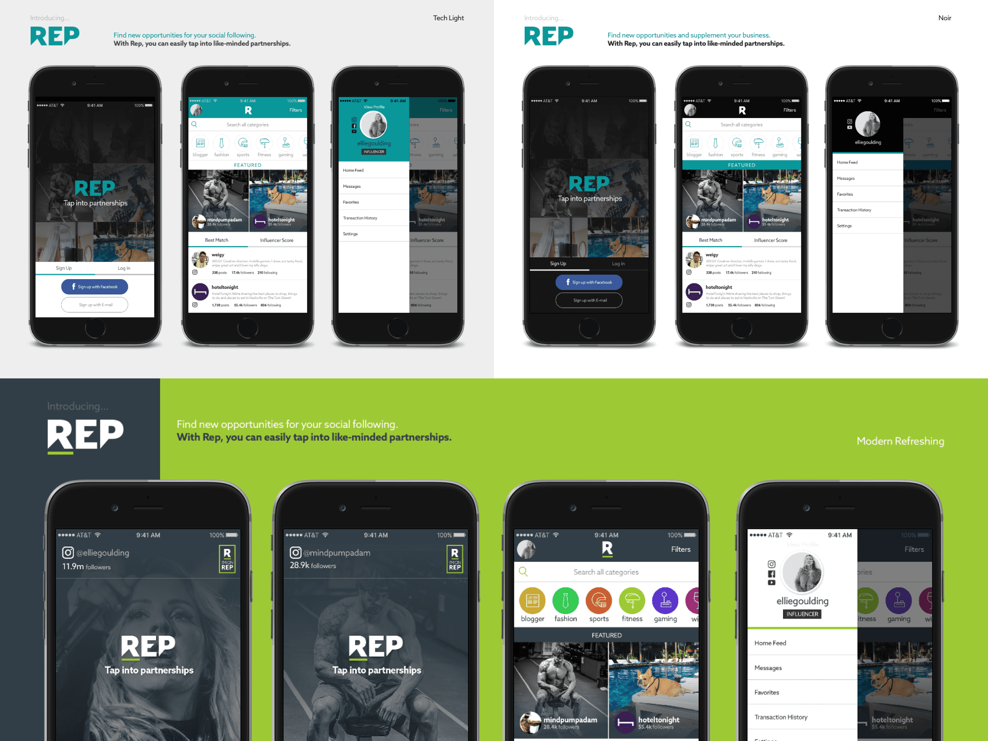 Aspiring influencers didn't need an agent because Rep would help them connect to brands directly. Brands loved it because they could search and tap into niches and micro-audiences easily. Rep was built mobile-first to fit cleanly into the average influencer's day-to-day but worked on all platforms to enable easy access at an office or on the go.