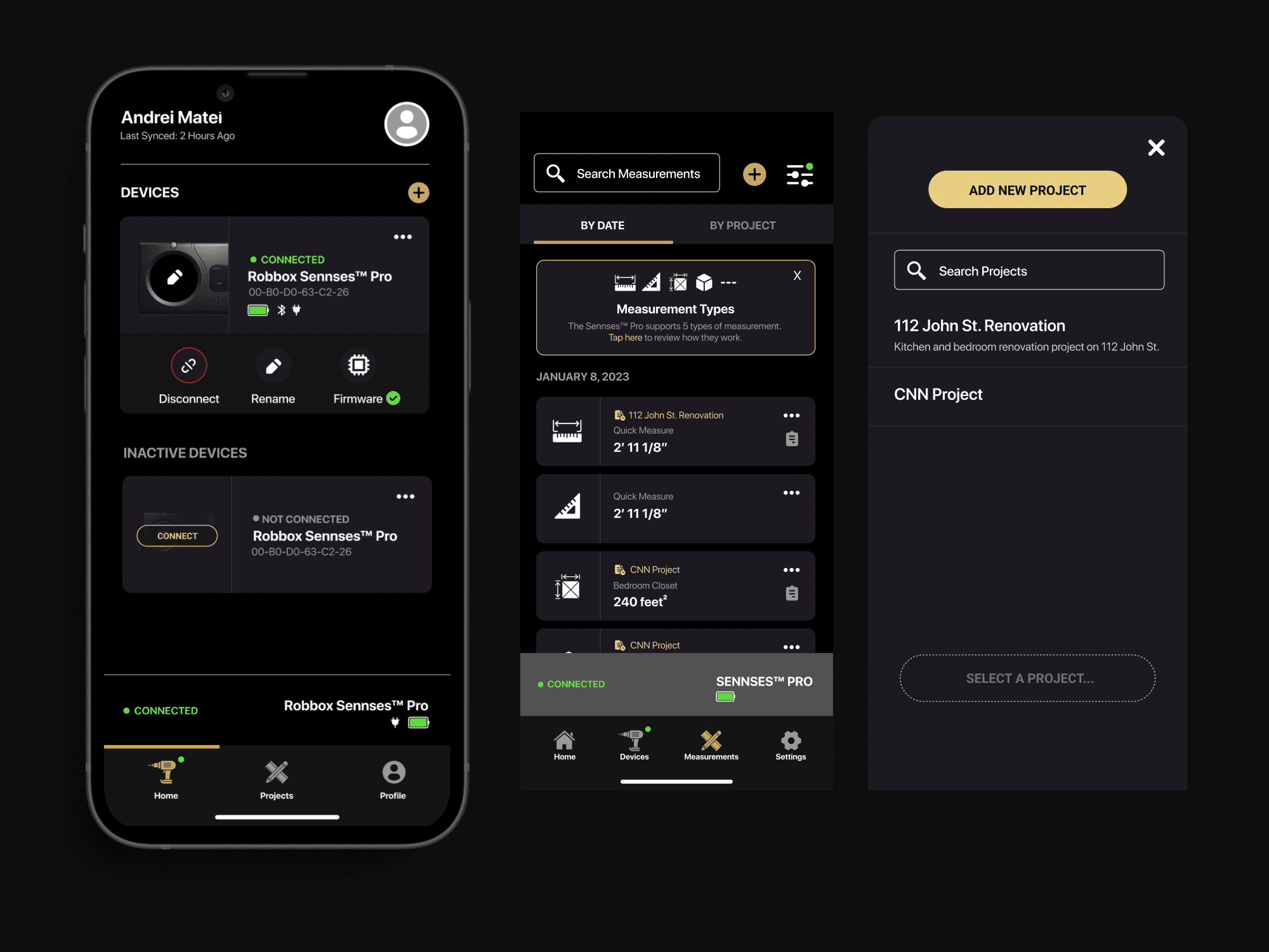 This required thoughtful iteration and a carefully designed user journey, ensuring a smooth interaction between the device and app. The result? A system that not only mirrors device controls when the device screen isn’t accessible but also enables easy organization of measurements into projects—making them readily available for future reference or effortless sharing with collaborators.